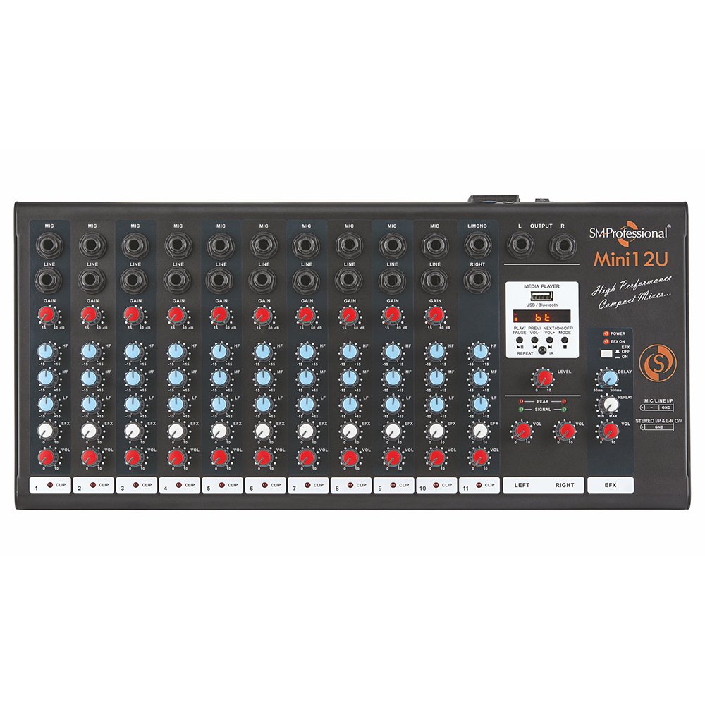 Gain control with 3-band EQ per channel. Built-in echo/delay processor with unique E-delay. Clip LED indication per channel. Signal & clip LED indication for master level. 1/4 TS unbalanced L/R main output. USB MP3 media player onboard with transport control and IR remote control. Built-in Bluetooth wireless streaming from smartphones, tablets, and laptops.