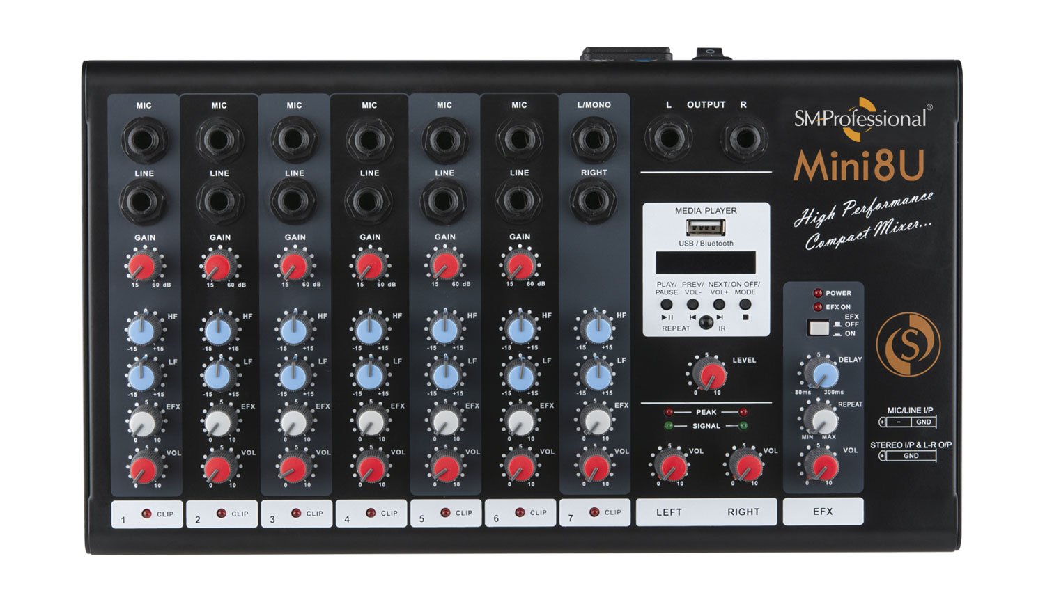 Gain control with 2-band EQ per channel. ? Built-in echo/delay processor with unique E-delay. Clip LED indication per channel. Signal & clip LED indication for master level. 1/4 TS unbalanced L/R main output. ? USB MP3 media player onboard with transport control and IR remote control. Built-in Bluetooth wireless streaming from smartphones, tablets, and laptops.