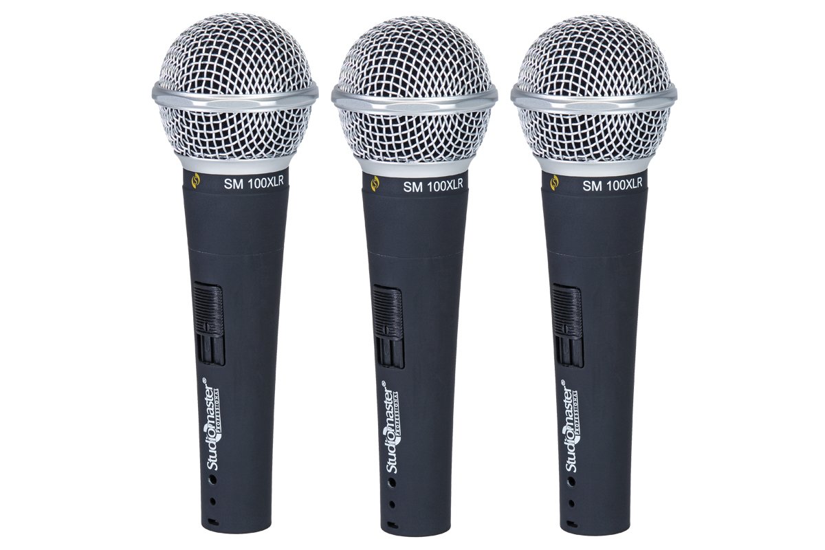 ? Pack of 3 SM100XLR Dynamic microphones. ? Wide frequency response tailored to suit speech, vocal & instruments. ? Dynamic Cardioid pick up patters minimizes off-axis pick up, reduces feedback & provides higher system gain. ? Suspended cartridge shock mount system to minimize handling noise ? Low-failure magnetic on-off switch ? Rugged body & dent-proof steel grill that withstands physical shocks.